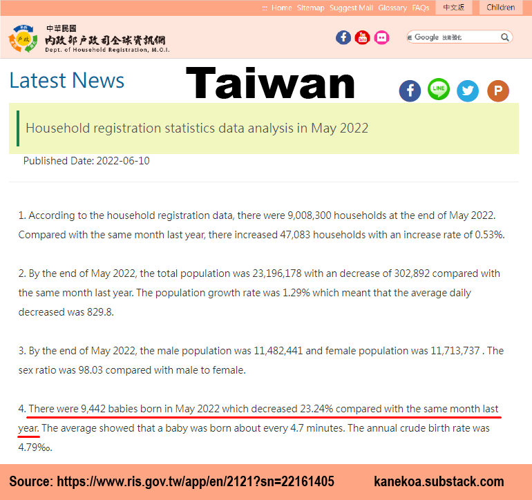 Taiwan reported a 23.2% decline in births in May 2022 compared to the same month in 2021.