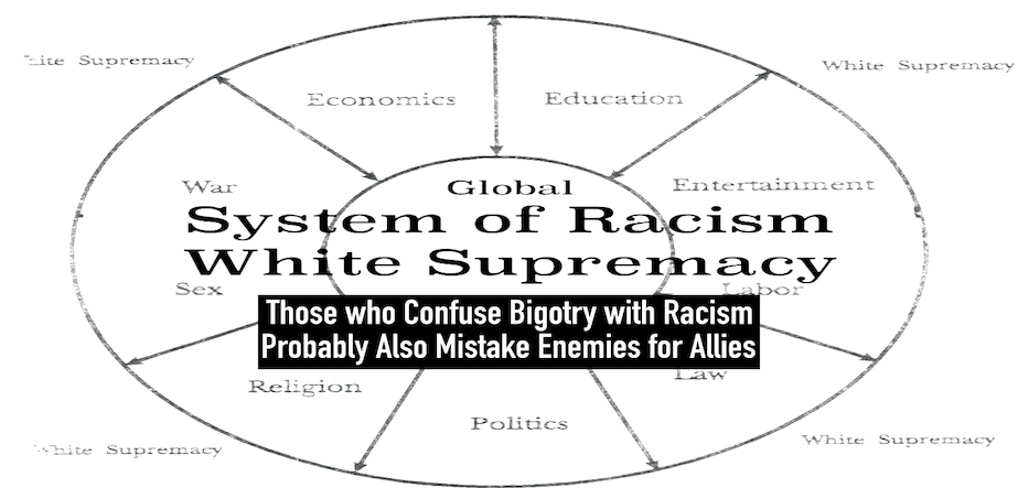 Belief that racism is only bigotry is a vital part of false programming sold to you by the vested interests for your cooperation and submission to your own oppression. Such belief is whitenology sold by elite whites - publishers, scholars, professionals and government representatives and also promoted by showcase Blacks who parrot such false consciousness programs in various styles.