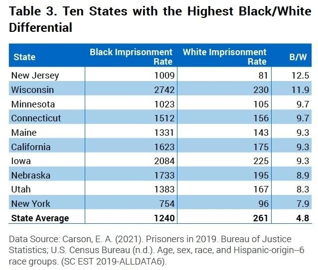 • A recent report from the Sentencing Project finds that Black Americans are incarcerated in state prisons across the country at nearly five times the rate of whites, and Latinx people are 1.3 times as likely to be incarcerated than non-Latinx whites. Seven states maintain a Black/white disparity larger than 9 to 1: California, Connecticut, Iowa, Maine, Minnesota, New Jersey, and Wisconsin. See above chart [MORE]