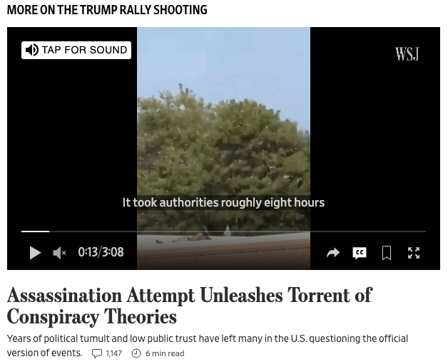 Today the Wall Street Journal explained to their elite, rich readership that “years of public tumult and low public trust have left many in the US questioning the official version of events.” Rest assured none of their journalists (aka “Yes Men” and “Yes Women”) would ever dare do such a thing as to challenge the competency or motives of authorities. Facts tending to show that Secret Service and police were knowledgeable of the Trump shooter’s presence surely must be false if the authorities said so. Questions about whether a second or third shooter were involved are apparently unreasonable to the elites in the Dependent Media who are engaged in the business of reality concealment.